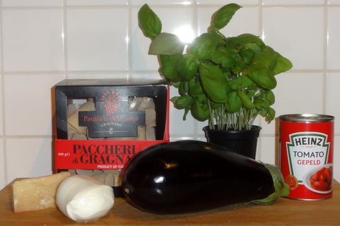 Today I felt like cooking something vegetarian. I had bought an eggplant and buffalo mozzarella, and had some very nice Paccheri di Gragnano lying around (given to me by Gennaro Esposito, the chef of our favorite restaurant in Italy (Torre del Saracino) during our last visit). The combination of eggplant, mozzarella, basil and tomato is classic. There are many different versions, the most common being melanzane alla parmigiana. This version has a different texture because of the use of pasta. Instead of Paccheri, you can use any kind of large pasta shape that can be stuffed such as shells or snails.