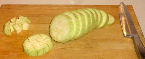 Cut off both ends of the eggplant and wash and dry or peel it (since Kees is allergic to eggplant peel, I always peel them but this is not needed). Dice the eggplant.