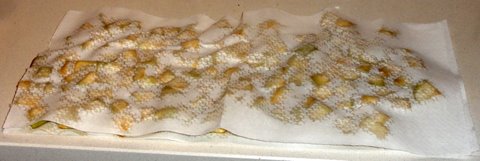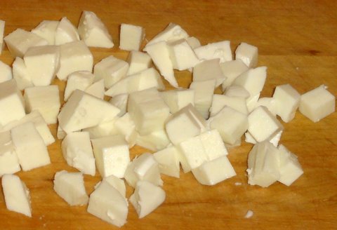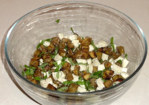 Dry the eggplant cubes with paper towels (it is not necessary to rinse away the salt as long as you haven’t used too much).