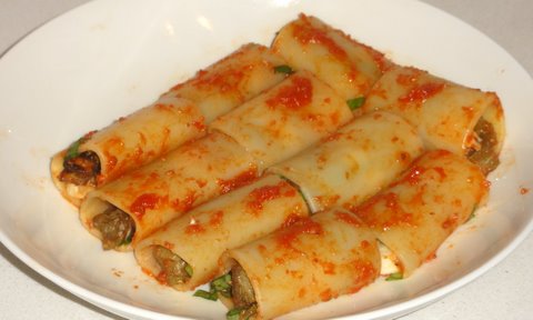 Stuff each of the pasta shapes with the eggplant-mozzarella mixture and arrange them in an oven-proof dish. (I put them directly onto the plates, since I have plates that can be used in the oven.)