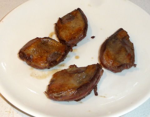 Rub the breast fillets with salt and freshly ground black pepper and sear them quickly in a mixture of hot butter and olive oil in a frying pan. Take the breast fillets out of the frying pan and put them on a plate to cool.