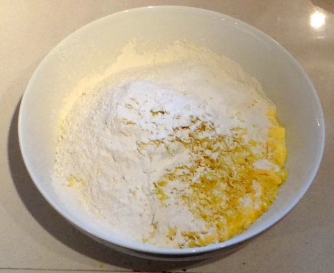 Put the sugar-butter-egg mixture in a bowl. Add the baking powder, sieved flour, pinch of salt and grated lemon zest.