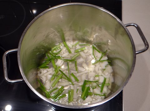 Chop the onion and the parsley stalks roughly (reserve the parsley leaves) and put into a put with the white wine.