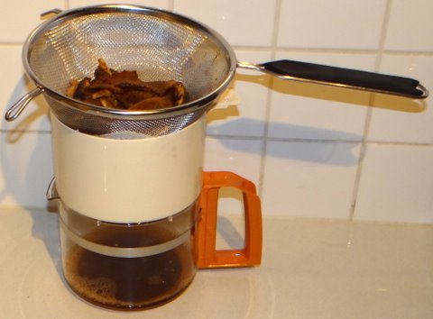 Drain the porcini mushrooms and filter the soaking liquid through a paper towel to remove any sand or other dirt. Rinse the mushrooms under running water.