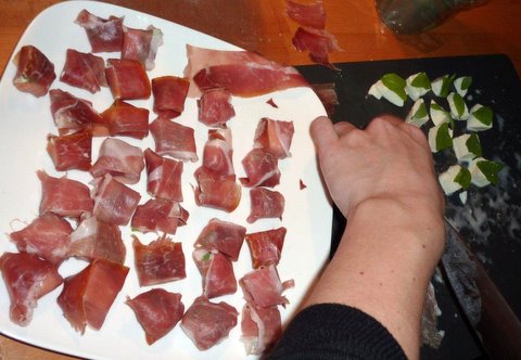 - Wrap each cube of mozzarella together with half a sage leave in thinly sliced prosciutto di parma (in total you will need around 200 grams or 7 oz)
