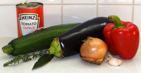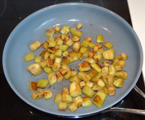 Meanwhile, wash and dry the eggplant or peel it, depending on whether you like the eggplant skin in your ratatouille or not. Cut off both ends and cut into cubes. Remove the red pepper from the pan and clean the pan. Sauté the eggplant for 5 minutes in 4 tbsp of olive oil. (You could salt the eggplant in advance to make it easier to fry as described in this recipe.)