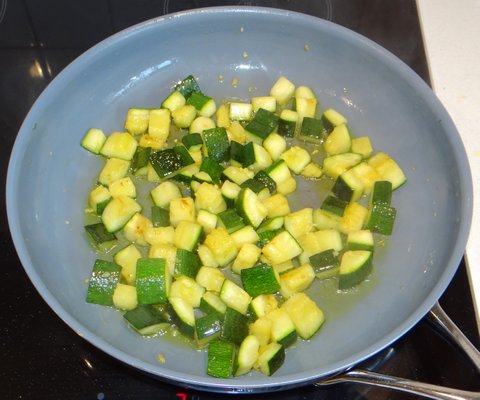 Wash and dry the zucchini. Cut the ends off and cut into cubes. Sauté for 5 minutes in 2 tbsp of olive oil.