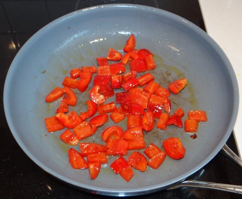 Meanwhile, wash and dry the red pepper. Remove the seeds and cut into cubes. Remove the zucchini from the pan and clean the pan. Sauté the red pepper for 5 minutes in 2 tbsp of olive oil.