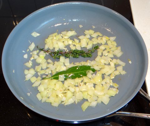 Meanwhile, clean the onion and chop it. Clean the garlic and mince it. Remove the eggplant from the pan and clean the pan. Sauté the onion in 2 tbsp olive oil until translucent. Add thyme, bay leaf, and garlic and sauté for 1 minute more.