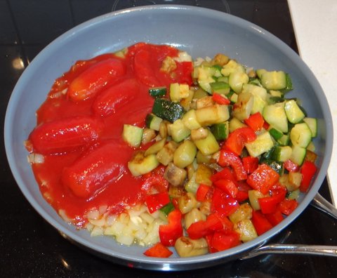 Add tomatoes, eggplant, zucchini and red pepper. Season with salt and freshly ground black pepper. Break the tomatoes into pieces with a spatula and mix. Let simmer uncovered over low heat for 60-90 minutes, uncovered, stirring now and then to prevent the ratatouille from sticking to the bottom of the pan and burning. Cook 60 minutes if you like your ratatouille more ‘al dente’ or 90 minutes if you like it softer.