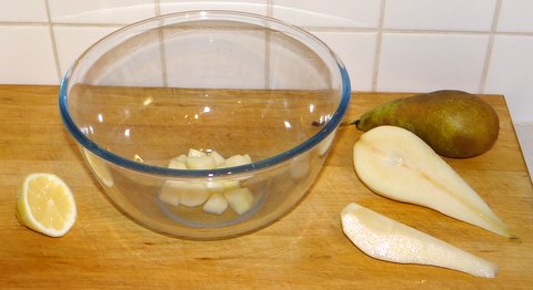 Grate the zest of the lemon and set aside. Peel the pears, remove the core and cut into cubes. Sprinkle the cubes lightly with lemon juice to prevent them from turning brown.