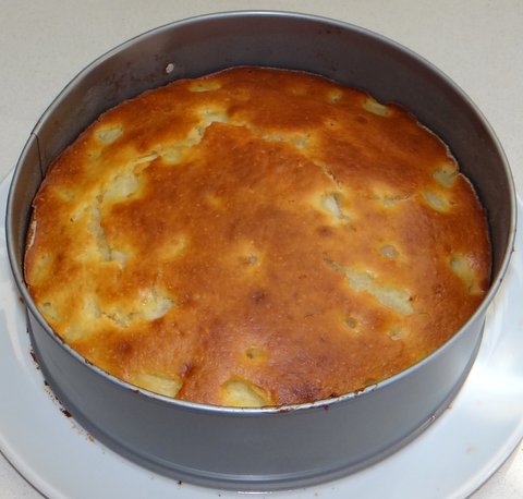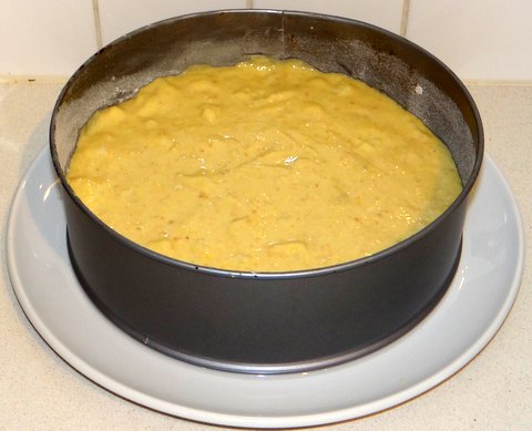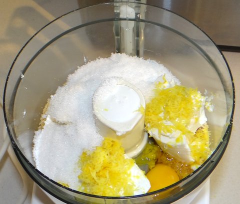Toast the almonds for 10 minutes in the oven at 160C/320F. Grind them in the food processor until fine. Add flour, sugar, lemon zest, eggs, pinch of salt, ricotta, baking powder and almond extract. Process until smooth. (In a Magimix this works fine without getting lumps. If your food processor is not as strong, it is better to add ingredients one by one and sieve the flour before adding.)