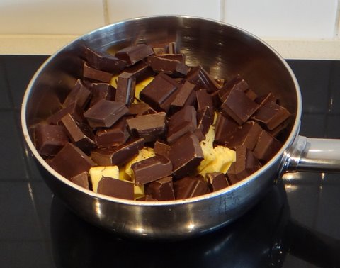 Melt the chocolate (broken into pieces) and the butter (cut into pieces) over very low heat or au bain marie.