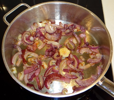 Slice the onions. Heat the oil in a frying pan and sauté the onion with the glove of garlic over low heat for 15 minutes, stirring now and then.