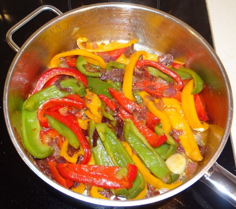 Meanwhile, clean the peppers and slice them lengthwise. Add the peppers after the onions have cooked for 15 minutes. Season with salt and freshly ground black pepper. Cover the pan and cook over low heat for 15 minutes without adding any liquid, stirring now and then.