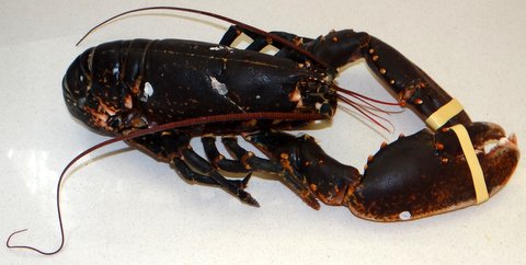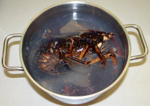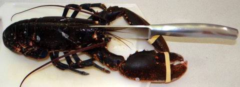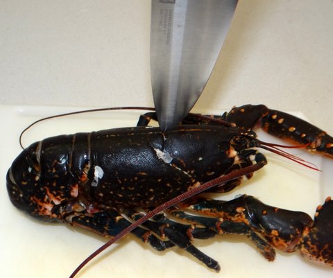 First make the lobster sluggish by freezing it for 15 minutes. Then insert the knife at the ‘cross’ on top of its head and thrust it down between its eyes. To see how to do this, you can have a look at this video of me killing another lobster.