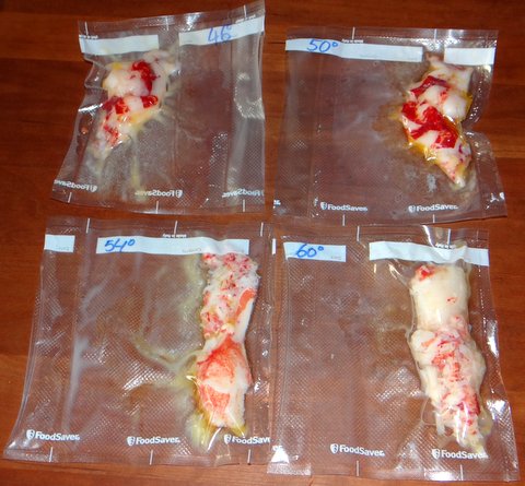 I shelled the lobster and divided the lobster meat into four parts that were individually sealed into vacuum pouches with some butter. The pouches were all cooked for 15 minutes at different temperatures as suggested by Modernist Cuisine.