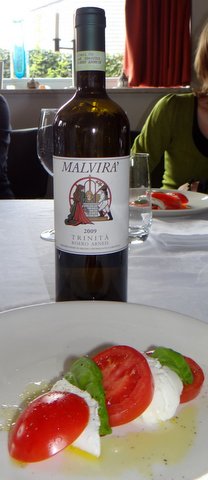 With a caprese salad this time we had an Arneis instead of a Gavi. Both are good matches, but if memory serves me right this was slightly better because this specific Arneis was a bit ’rounder’ and therefore a slightly better match for the mozzarella than the Gavi we had last time.