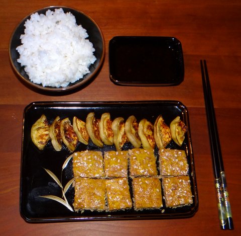 Serve meatloaf squares (one serving = 8 squares) with eggplant slices, Japanese rice and a dipping sauce of Japanese soy sauce with grated ginger.