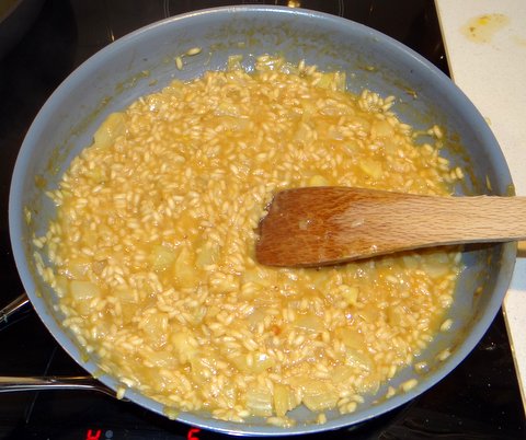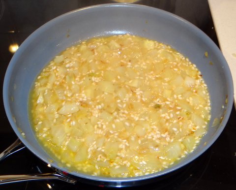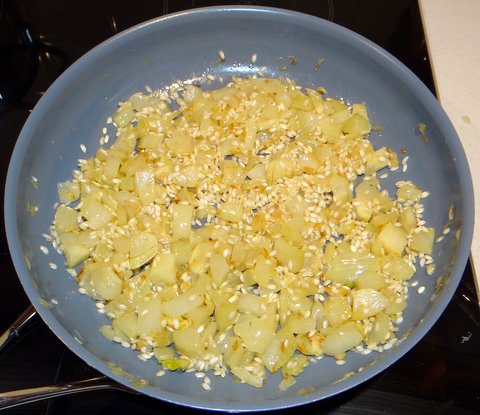 When the fennel is tender, add the rice and toast for a few minutes until the edges become translucent.