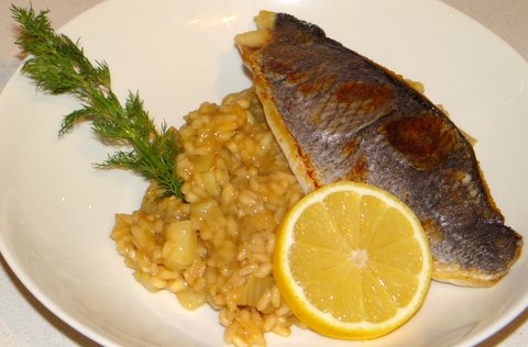 Serve the risotto on preheated plates with the fish (skin side up), a sprig of dill or fennel fronds and a slice of lemon. Great with almost any dry white wine.
