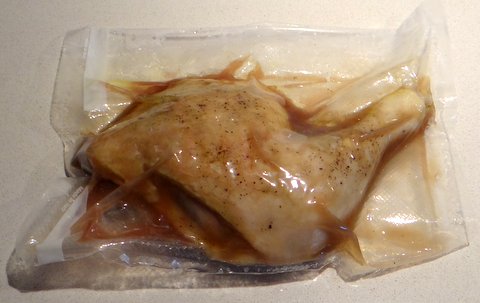 But I wanted to see if I could create something like my grondmother’s petroleumstel chicken by cooking the leg of a stewing hen sous-vide. So I seasoned two legs with salt and freshly ground black pepper and sealed them into individual pouches, skin on. I then cooked them at 64C/147F, the regular temperature for chicken legs. But instead of the usual 2 to 5 hours, I tried the first leg after 24 hours. It was edible but still way too tough, so I decided to leave in the second leg for 72 hours (i.e. 3 days) total.