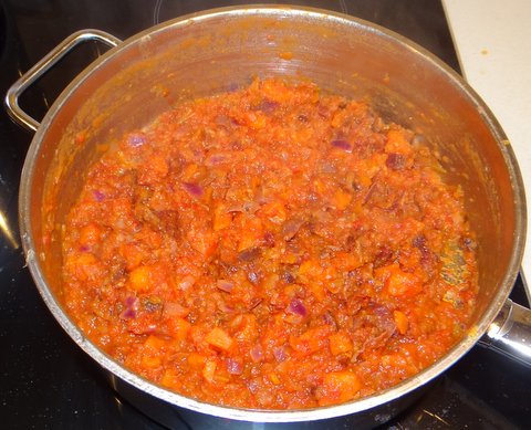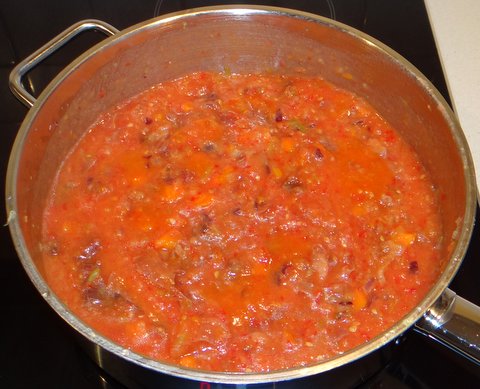 Add the sieved tomatoes to the prosciutto and vegetables and season with freshly ground black pepper and just a pinch of salt. Let this simmer, uncovered, for half an hour or so.