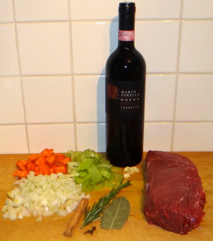 A famous dish from the Piemonte region in Italy is Brasato al Barolo, beef braised in Barolo, king of the red wines. Since a bottle of good Barolo does not come cheap, it is good to realize that you can achieve an almost identical result using another wine from Piemonte made from the Nebbiolo grape that is not as expensive. And if you marinate the meat in a ziploc bag rather than in a bowl, you only need half the bottle and can drink the other half with the meat.