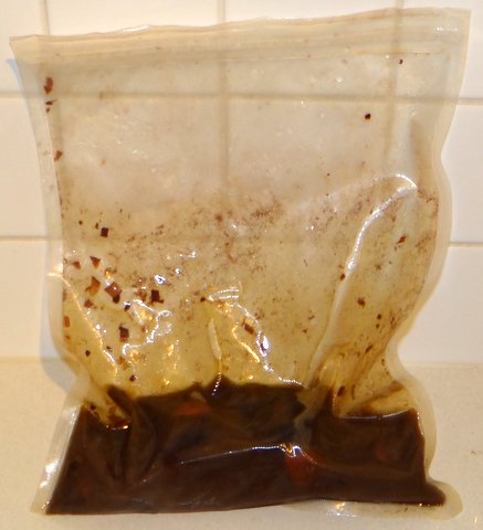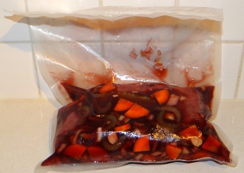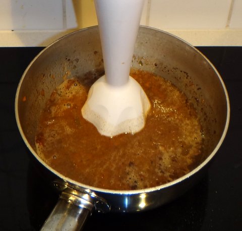 Put the contents of the pouch into a saucepan, but return the meat to the zip pouch and put it back into the water bath to keep it warm while you are finishing the sauce.