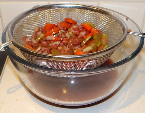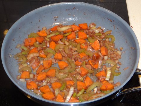 Sauté the vegetables in the fat remaining from browning the meat until they are tender. (Especially when cooking sous-vide it is important to cook the vegetables sufficiently tender, because the temperature at which you will cook sous-vide will not be sufficient to cook the vegetables.)