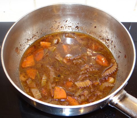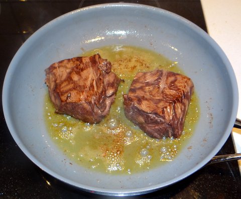 Brown the meat on all sides in the olive oil and butter. Take the meat out of the pan.