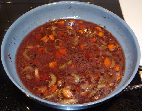Chop the carrot, onion, celery and garlic. Put the meat with the wine, the vegetables and the spices into a ziploc bag and marinate for 12-24 hours in the refrigerator.