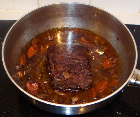 For the conventional preparation, return the meat to the pan (here I’ve moved it to a smaller pan), cover and simmer for 2-3 hours over very low heat. After that, take out the meat and keep it warm in a very low oven (75C/165F or less), wrapped in aluminum foil.