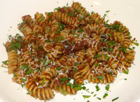 If you have more sauce than you’d like to serve with the meat, you can cook some pasta and have that with the sauce first as a primo before having the meat as secondo. This is often done in Italy with braised meats. Serve with some freshly grated parmigiano reggiano and chopped parsley. Fusilli are an excellent pasta shape for this, as they absorb the sauce really well. If you like, you can stir a tablespoon of double concentrated tomato paste and a pinch of sugar into the sauce.