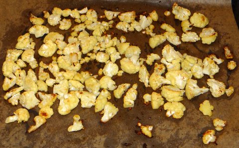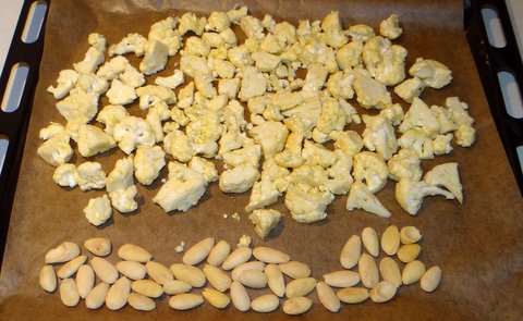 Take the cauliflower out of the oven when golden, about half an hour after you took out the almonds.