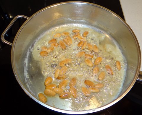 Melt the butter in a frying pan. Add the garlic and almonds when the butter forms. Sauté for about 1 minute, do not let the garlic color.