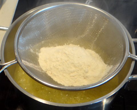 Add sieved flour off the heat (otherwise the flour will burn easily).
