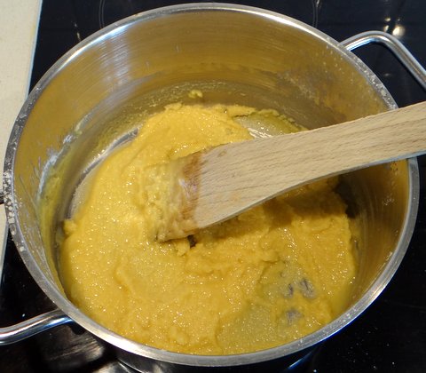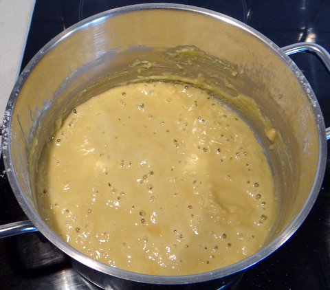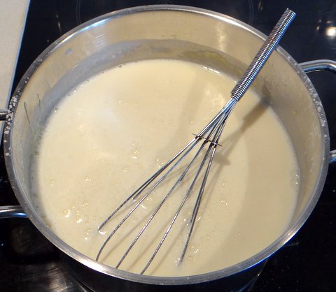 Add all the warm milk at once and whisk well to prevent lumps from forming. Continue to stir and cook over medium heat until you obtain a nice thickness (not too thick, not too thin).