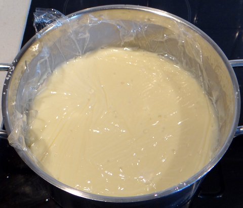 Cover with plastic wrap, pressed tightly onto the surface of the béchamel, to prevent a skin on the sauce.