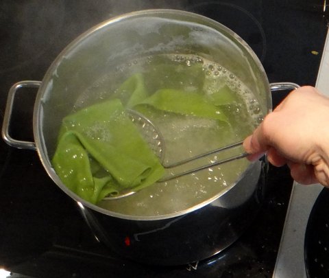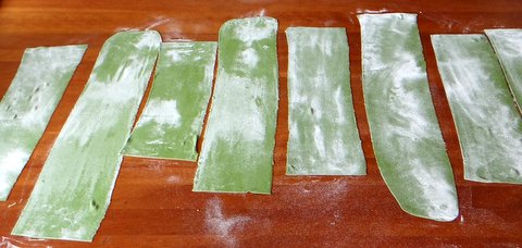 green pasta dough from 3 eggs, 150 grams (1/3 lb) fresh spinach and about 400 grams (3 cups) Italian 00 flour