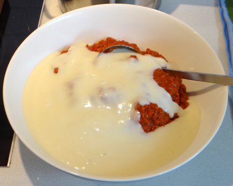 Mix the ragù alla bolognese with 2/3 of the béchamel sauce.