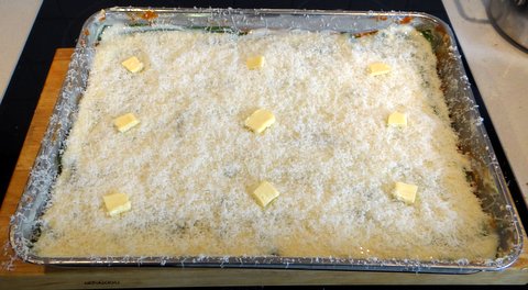 Cover with freshly grated parmigiano reggiano and dot with bits of butter.