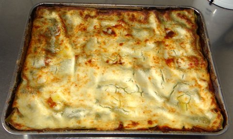 You are now ready to assemble the lasagna. Butter a large lasagna dish. Cover the bottom with pasta sheets. Use a knife or scissors to cut them to size if needed.