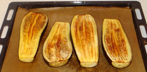Preheat the oven to 175C/350F. Cut the ends off the eggplants and halve them lengthwise. Brush them with olive oil on all sides. Roast for 30 minutes, skin side down, at 175C/350F until golden. Let cool until you can handle them.