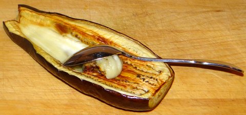 Sprinkle the eggplant skins with salt and reserve them. Roughly chop the pulp.