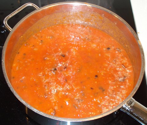 Add the tomatoes and the olives as soon as most of the wine has evaporated. Cook over medium heat, stirring to let the sauce thicken.