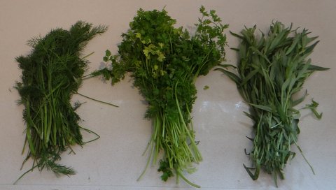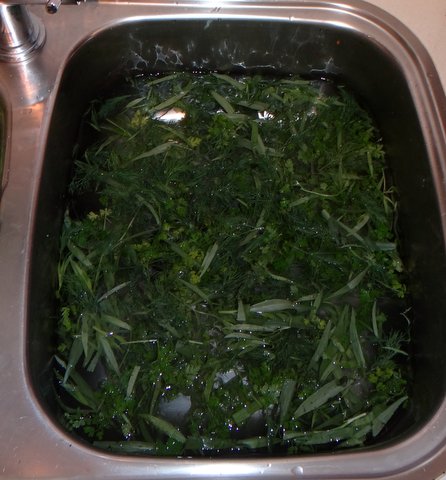To prepare the herb salad, I carefully removed all the tough stems of the herbs and washed the leaves in cold water.