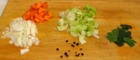 Roughly chop the onion, carrot, celery and bay leaves.