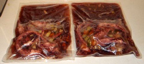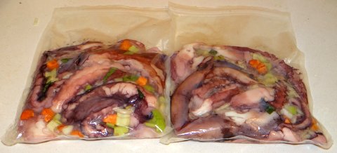Season the octopus ligthly with salt. Put the octopus in 1 or 2 sous-vide pouches with the onion, carrot, celery, bay leaves, juniper berries, and pepper corns. I used zip pouches because the octopus releases a lot of liquid and can therefore be difficult to seal with a FoodSaver-type vacuum sealer.