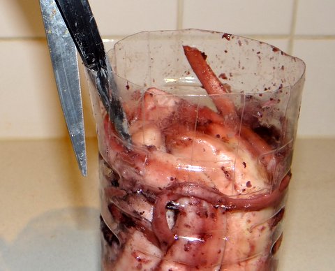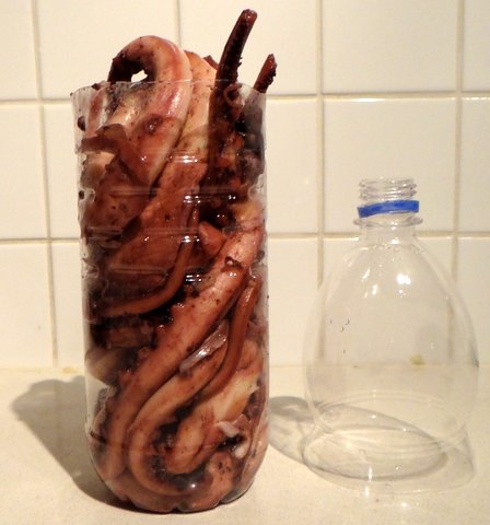 Cut the top of a plastic water bottle (preferably still water) and punch a few small holes in the bottom. Put the octopus legs in the bottle as vertically and with as little space remaining in between as possible.
